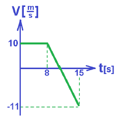 من اللحظة t = 8s ، تنخفض سرعة الجسم بوتيرة ثابتة (يتحرك الجسم بتسارع سالب) حتى نهاية حركته في اللحظة t=15s ، في هذه اللحظة تكون سرعة الجسم سالبة ومقدارها «math xmlns=¨http://www.w3.org/1998/Math/MathML¨»«mstyle mathsize=¨20px¨»«mi mathvariant=¨bold-italic¨ mathcolor=¨#0000FF¨»V«/mi»«mo mathvariant=¨bold¨ mathcolor=¨#0000FF¨»=«/mo»«mo mathvariant=¨bold¨ mathcolor=¨#0000FF¨»-«/mo»«mn mathvariant=¨bold¨ mathcolor=¨#0000FF¨»11«/mn»«mfrac mathcolor=¨#0000FF¨»«mi mathvariant=¨bold¨»m«/mi»«mi mathvariant=¨bold¨»S«/mi»«/mfrac»«/mstyle»«/math».