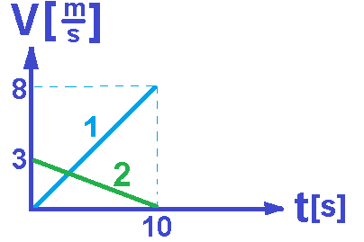 للتلخيص: يتحرك الجسمان معًا من نفس اللحظة ومن نقطة بداية المحور، في البداية يتحرك الجسم 1 من حالة السكون والجسم 2 لديه سرعة ابتدائية. لهذا السبب الشخص الثاني يتقدم في البداية. أثناء حركة الجسمين، تزداد سرعة الجسم 1 وسرعة الجسم 2 آخذة بالنقصان، وبالتالي في نهاية الحركة ، سيتقدم الجسم 1 على الجسم 2.