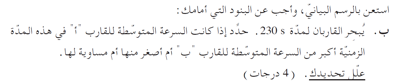 .نتطرق إلى حركة القارب "ب" من اللحظة t = 150s حتى اللحظة t = 230s ، من خلال الرسم البياني يمكن ملاحظة أن الإزاحة هي 1000 متر ، وزمن الحركة 80 ثانية.