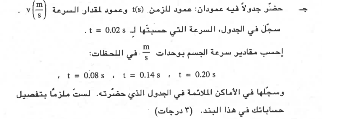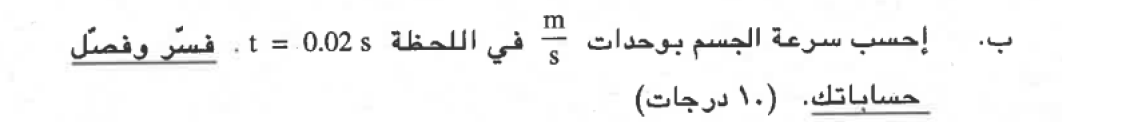 خلال فترة حركة قصيرة، يكون متوسط سرعة الحركة مساويًا تقريبًا للسرعة في منتصف الفترة الزمنية. لإيجاد سرعة الجسم في اللحظة t = 0.02s ، يجب حساب متوسط السرعة في أول 0.04 ثانية: