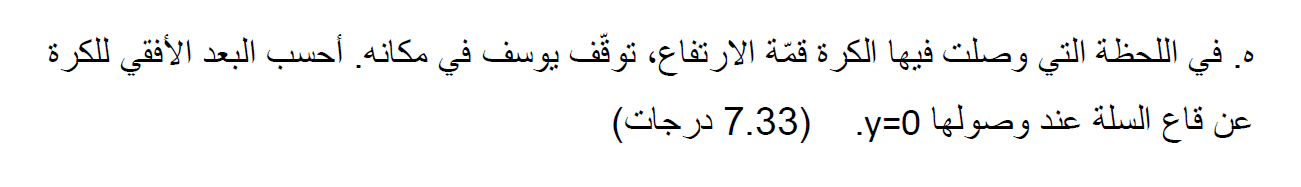 نستخدم دالة المكان كدالة للزمن المناسبة للحركة بسرعة ثابتة، ونجد المسافة الأفقية التي تقطعها الكرة، من نقطة قمة ارتفاعها حتى وصلت الكرة إلى ارتفاع السلة: