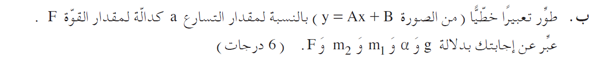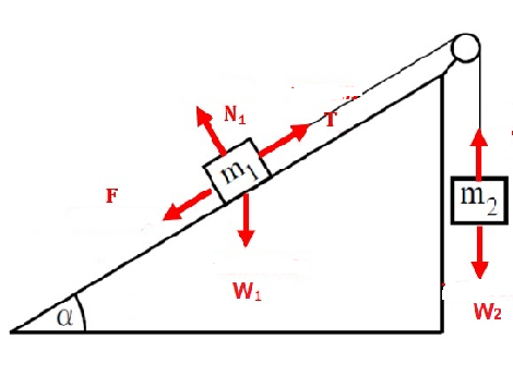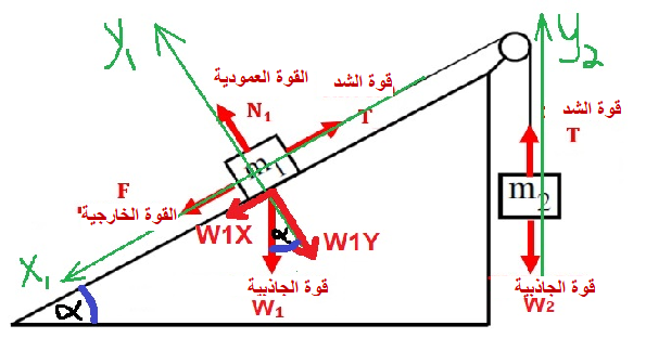 نعوّض التعبير لقوة الشد: «math xmlns=¨http://www.w3.org/1998/Math/MathML¨»«mstyle mathsize=¨20px¨»«mo mathvariant=¨bold¨ mathcolor=¨#0000FF¨»§#160;«/mo»«mi mathvariant=¨bold¨ mathcolor=¨#0000FF¨»T«/mi»«mo mathvariant=¨bold¨ mathcolor=¨#0000FF¨»=«/mo»«msub mathcolor=¨#0000FF¨»«mi mathvariant=¨bold¨ mathcolor=¨#0000FF¨»m«/mi»«mn mathvariant=¨bold¨»2«/mn»«/msub»«mo mathvariant=¨bold¨ mathcolor=¨#0000FF¨»§#183;«/mo»«mi mathvariant=¨bold¨ mathcolor=¨#0000FF¨»a«/mi»«mo mathvariant=¨bold¨ mathcolor=¨#0000FF¨»+«/mo»«msub mathcolor=¨#0000FF¨»«mi mathvariant=¨bold¨ mathcolor=¨#0000FF¨»m«/mi»«mn mathvariant=¨bold¨»2«/mn»«/msub»«mo mathvariant=¨bold¨ mathcolor=¨#0000FF¨»§#183;«/mo»«mi mathvariant=¨bold¨ mathcolor=¨#0000FF¨»g«/mi»«/mstyle»«/math» بالمعادلة: «math xmlns=¨http://www.w3.org/1998/Math/MathML¨»«mstyle mathsize=¨20px¨»«mi mathvariant=¨bold¨ mathcolor=¨#0000FF¨»F«/mi»«mo mathvariant=¨bold¨ mathcolor=¨#0000FF¨»+«/mo»«msub mathcolor=¨#0000FF¨»«mi mathvariant=¨bold¨ mathcolor=¨#0000FF¨»m«/mi»«mn mathvariant=¨bold¨»1«/mn»«/msub»«mo mathvariant=¨bold¨ mathcolor=¨#0000FF¨»§#183;«/mo»«mi mathvariant=¨bold¨ mathcolor=¨#0000FF¨»g«/mi»«mo mathvariant=¨bold¨ mathcolor=¨#0000FF¨»§#183;«/mo»«mi mathvariant=¨bold¨ mathcolor=¨#0000FF¨»sin«/mi»«mo mathvariant=¨bold¨ mathcolor=¨#0000FF¨»(«/mo»«mi mathvariant=¨bold¨ mathcolor=¨#0000FF¨»§#945;«/mi»«mo mathvariant=¨bold¨ mathcolor=¨#0000FF¨»)«/mo»«mo mathvariant=¨bold¨ mathcolor=¨#0000FF¨»-«/mo»«mi mathvariant=¨bold¨ mathcolor=¨#0000FF¨»T«/mi»«mo mathvariant=¨bold¨ mathcolor=¨#0000FF¨»=«/mo»«msub mathcolor=¨#0000FF¨»«mi mathvariant=¨bold¨ mathcolor=¨#0000FF¨»m«/mi»«mn mathvariant=¨bold¨»1«/mn»«/msub»«mo mathvariant=¨bold¨ mathcolor=¨#0000FF¨»§#183;«/mo»«msub mathcolor=¨#0000FF¨»«mi mathvariant=¨bold¨ mathcolor=¨#0000FF¨»a«/mi»«mn mathvariant=¨bold¨»1«/mn»«/msub»«/mstyle»«/math»