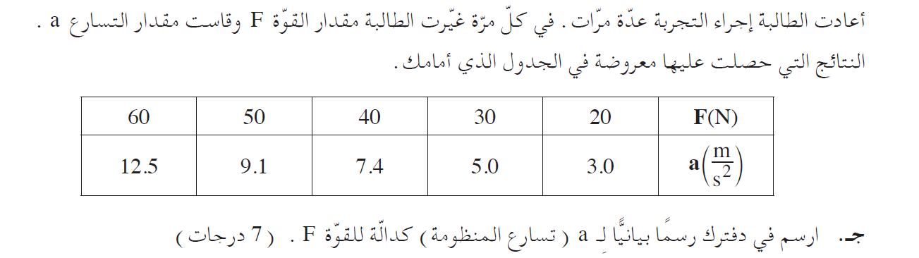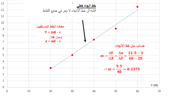 نجد القوة F التي يكون بها التسارع يساوي صفرًا ، هذه القيمة تساوي قيمة نقطة تقاطع الدالة مع المحور الأفقي F .