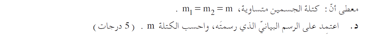 كتلتي الجسمين متساوية, لذا: m1=m2 نُشير إلى كتلة كل جسم بواسطة m، ونجد قيمة m، باستخدام ميل الرسم البياني: