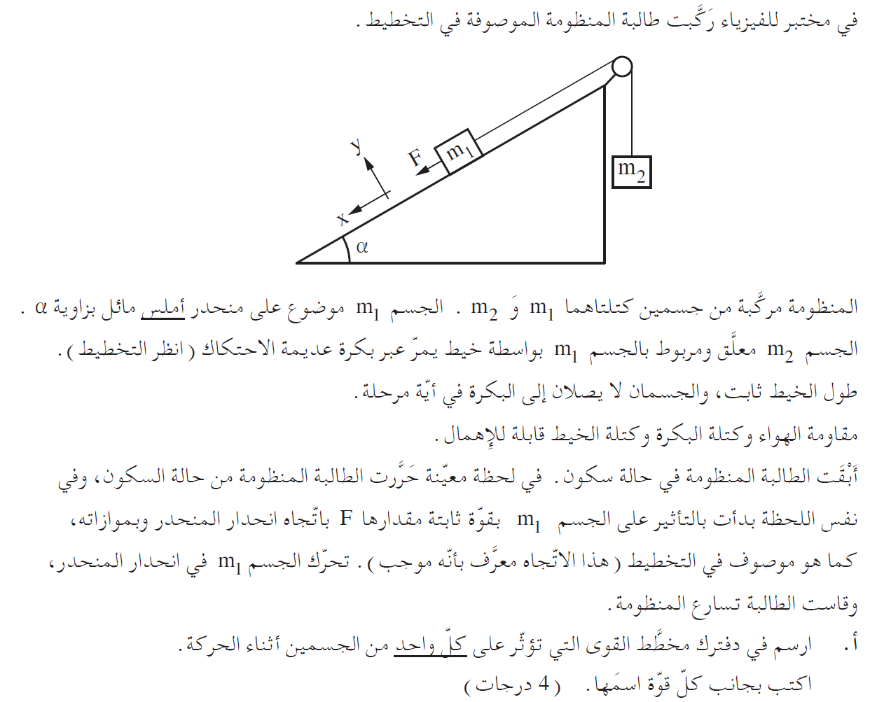 نكتب معادلة الحركة للجسم m1, في اتجاه عمودي للسطح المائل:«math xmlns=¨http://www.w3.org/1998/Math/MathML¨»«mstyle mathsize=¨20px¨»«menclose mathcolor=¨#0000FF¨ notation=¨box¨»«mi mathvariant=¨bold¨»N«/mi»«mo mathvariant=¨bold¨»=«/mo»«mi mathvariant=¨bold¨»m«/mi»«mn mathvariant=¨bold¨»1«/mn»«mo mathvariant=¨bold¨»§#183;«/mo»«mi mathvariant=¨bold¨»g«/mi»«mo mathvariant=¨bold¨»§#183;«/mo»«mi mathvariant=¨bold¨»cos«/mi»«mo mathvariant=¨bold¨»(«/mo»«mi mathvariant=¨bold¨»§#945;«/mi»«mo mathvariant=¨bold¨»)«/mo»«/menclose»«/mstyle»«/math»