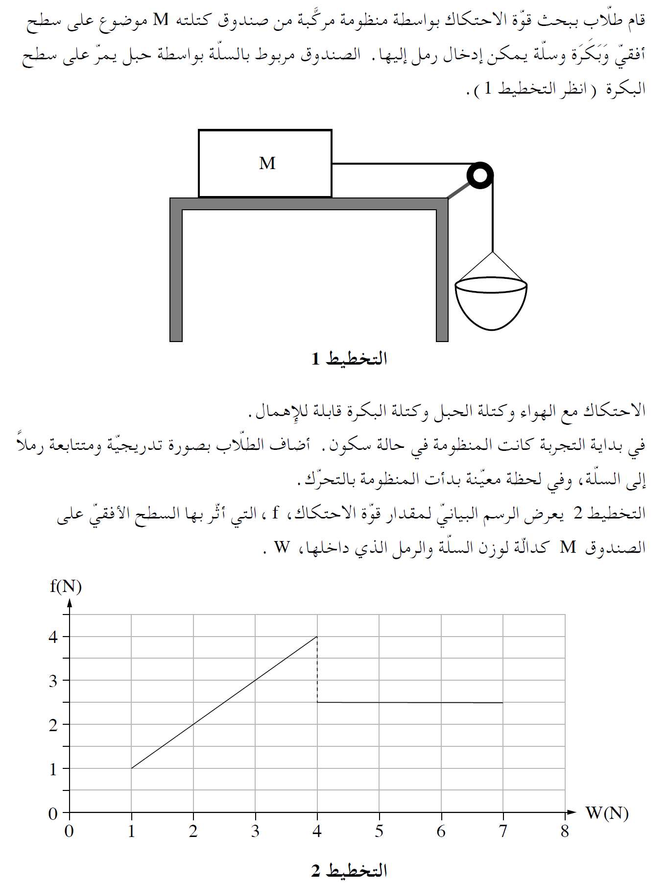 عندما يكون وزن السلة 6 نيوتن ، ينزلق الصندوق على الطاولة، وتؤثر عليه قوة الاحتكاك الحركية.