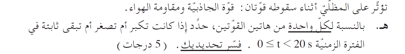 لذلك تتغير قوة الاحتكاك مع الهواء، وتستمر في الازدياد حتى اللحظة t = 13s من هذه اللحظة حتى اللحظة t = 20s تكون قوة الاحتكاك ثابتة ومساوية لقوة الجاذبية.