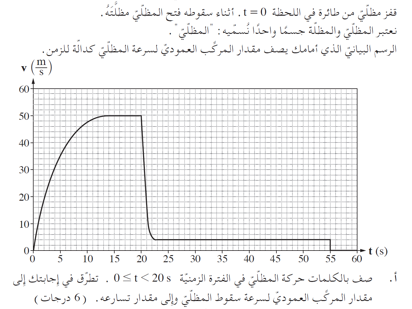 المسافة العمودية التي يقطعها المظلي من اللحظة t = 0s حتى تفتح المظلة، تساوي مساحة المساحة المحصورة بين الدالة ومحور الزمن في هذه الفترة الزمنية.