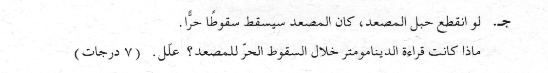 ومن هنا فإن قراءة مقياس القوة بعد انقطاع حبل المصعد هي: صفر نيوتن.