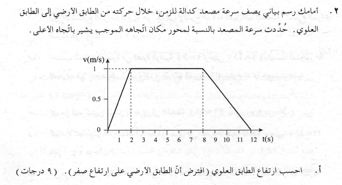 يصف الرسم البياني حركة المصعد من الطابق الأرضي إلى الطابق العلوي. الازاحة مساوية لارتفاع الأرضية العلوية.
