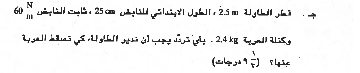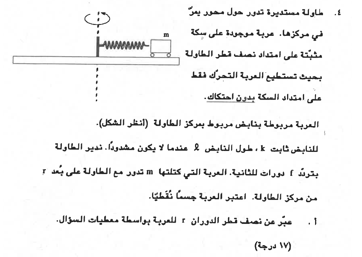 تتحرك العربة في حركة دائرية، القوة الجاذبة نحو المركز هي القوة التي يشغّلها النابض.
