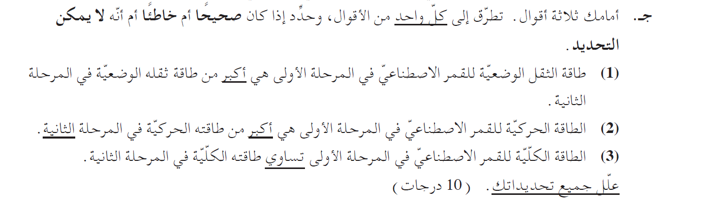 في المرحلة الأولى ، يكون نصف قطر مدار القمر الاصطناعي أكبر، وبالتالي تكون طاقته الحركية أصغر. القول غير صحيح.