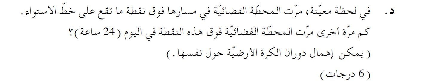 נחשב את מספר ההקפות N שמשלים הלוויין במשך יממה:1. السؤال هو كم مرة أخرى من اللحظة التي مرّت فيها المحطة الفضائية فوق نقطة ما على خط الاستواء ستمر فوق نفس النقطة خلال 24 ساعة.