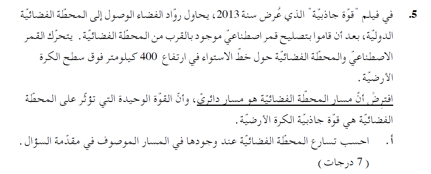 نكتب معادلة الحركة، ونعبر عن تسارع المحطة الفضائية من معادلة الحركة الدائرية: