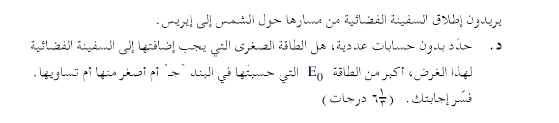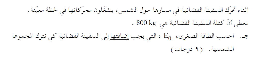 الطاقة الصغرى اللازم إضافتها للسفينة الفضائية هي: «math xmlns=¨http://www.w3.org/1998/Math/MathML¨»«mn mathvariant=¨bold¨»3«/mn»«mo mathvariant=¨bold¨».«/mo»«mn mathvariant=¨bold¨»54«/mn»«mo mathvariant=¨bold¨»§#183;«/mo»«msup»«mn mathvariant=¨bold¨»10«/mn»«mn mathvariant=¨bold¨»11«/mn»«/msup»«mi mathvariant=¨bold¨»J«/mi»«/math».