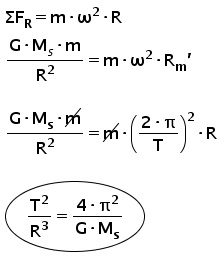 נכתוב את משוואת התנועה המעגלית לכוכב הלכת , ונבטא ממשוואת התנועה את היחס בין ריבוע זמן המחזור לרדיוס המסלול בשלישית: