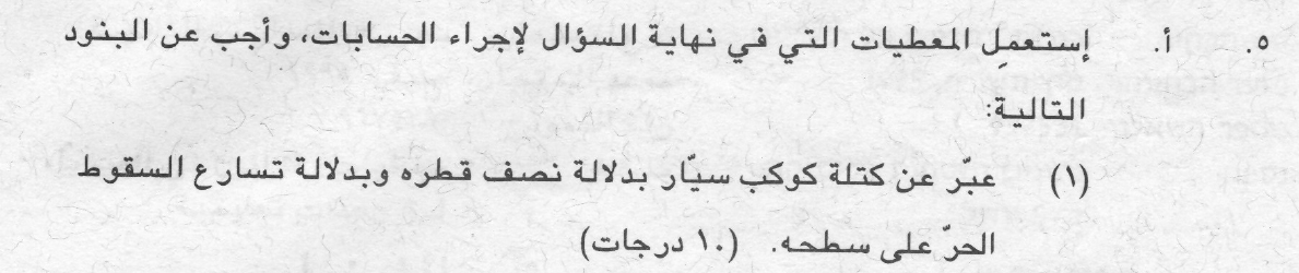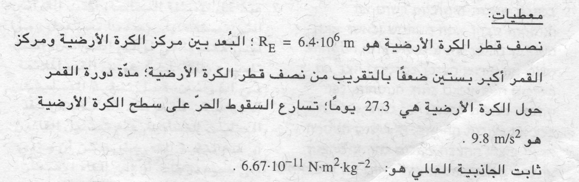 في بداية السؤال تظهر معطيات حركة القمر ، نجد كتلة الكرة الأرضية حسب معطيات حركة القمر.