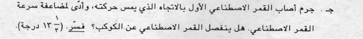 نتيجة الاصطدام تزداد سرعة القمر الاصطناعي بمرتين ومن تعبير الطاقة الحركية: «math xmlns=¨http://www.w3.org/1998/Math/MathML¨»«msub mathcolor=¨#0000FF¨»«mi mathvariant=¨bold¨ mathcolor=¨#0000FF¨»E«/mi»«mi mathvariant=¨bold¨»K«/mi»«/msub»«mo mathvariant=¨bold¨ mathcolor=¨#0000FF¨»=«/mo»«mfrac mathcolor=¨#0000FF¨»«mn mathvariant=¨bold¨»1«/mn»«mn mathvariant=¨bold¨»2«/mn»«/mfrac»«mo mathvariant=¨bold¨ mathcolor=¨#0000FF¨»§#183;«/mo»«mi mathvariant=¨bold¨ mathcolor=¨#0000FF¨»m«/mi»«mo mathvariant=¨bold¨ mathcolor=¨#0000FF¨»§#183;«/mo»«msup mathcolor=¨#0000FF¨»«mi mathvariant=¨bold¨ mathcolor=¨#0000FF¨»V«/mi»«mn mathvariant=¨bold¨»2«/mn»«/msup»«/math» تزداد الطاقة الحركية 4 مرات ويكون تعبير الطاقة الحركية للقمر الاصطناعي بعد زيادة السرعة كما يلي: