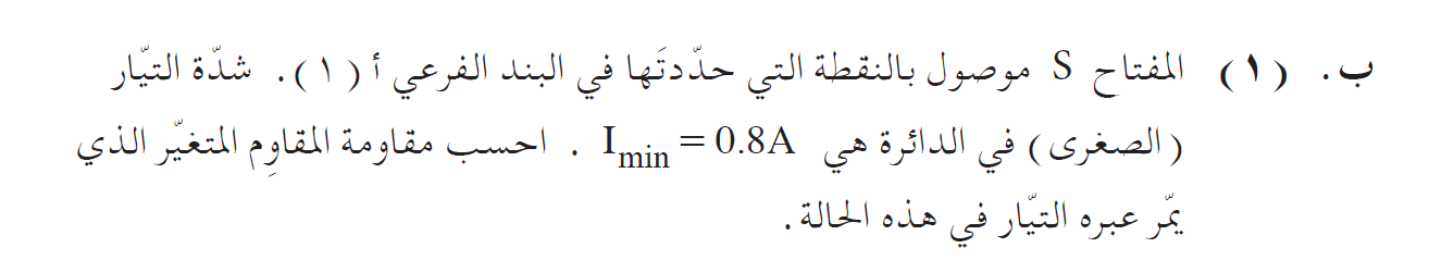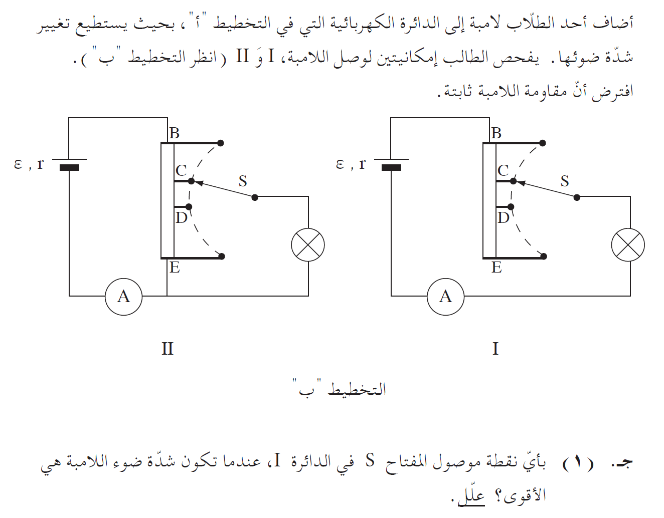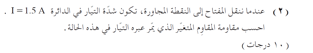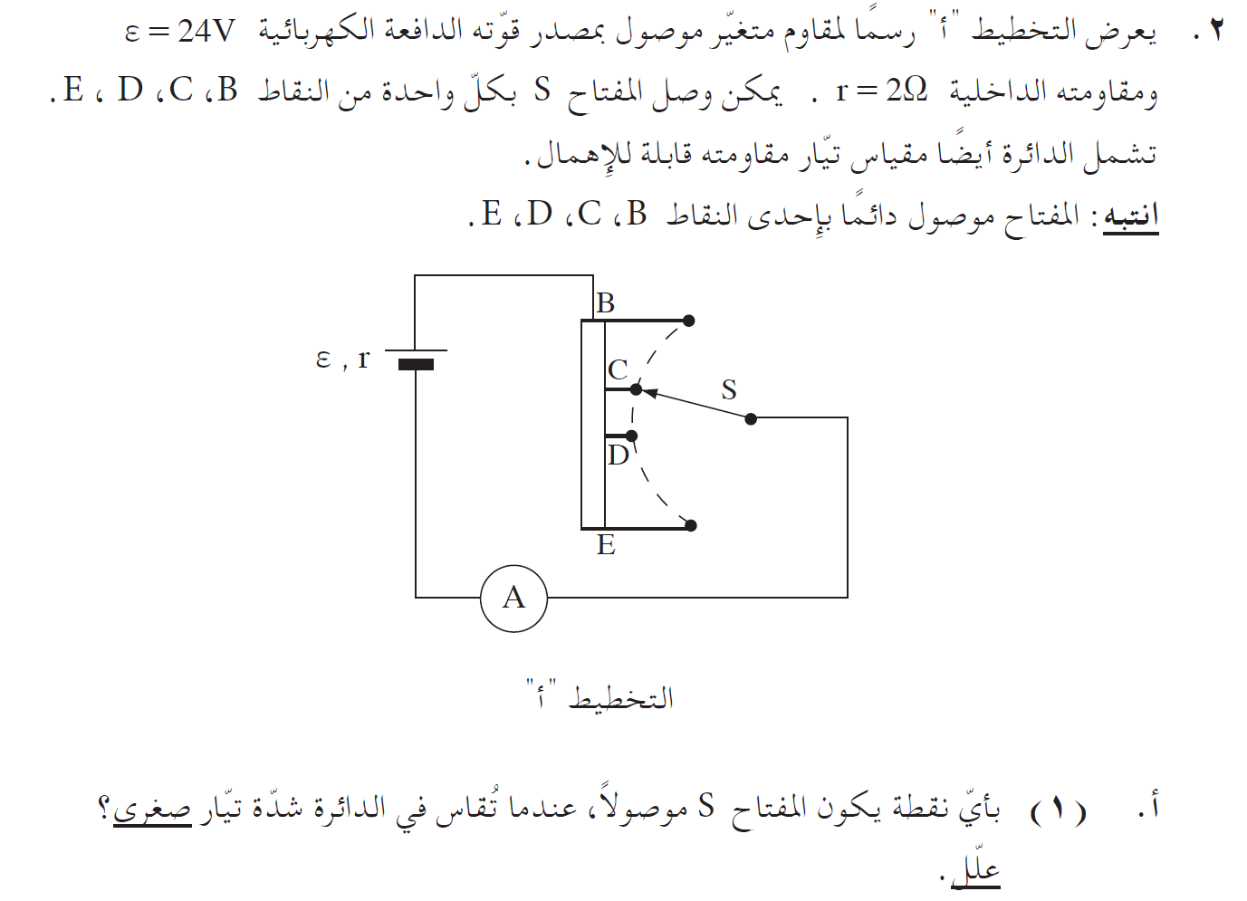 عند توصيل المفتاح بالنقطة E، يكون طول السلك الموصل الذي يتدفق من خلاله التيار أكبر ما يمكن، من التعبير عن مقاومة السلك الموصل «math xmlns=¨http://www.w3.org/1998/Math/MathML¨»«mi mathvariant=¨bold¨ mathcolor=¨#FF0000¨»R«/mi»«mo mathvariant=¨bold¨ mathcolor=¨#FF0000¨»=«/mo»«mfrac mathcolor=¨#FF0000¨»«mrow»«mi mathvariant=¨bold¨»§#961;«/mi»«mo mathvariant=¨bold¨»§#183;«/mo»«mi mathvariant=¨bold¨»L«/mi»«/mrow»«mi mathvariant=¨bold¨»A«/mi»«/mfrac»«/math»