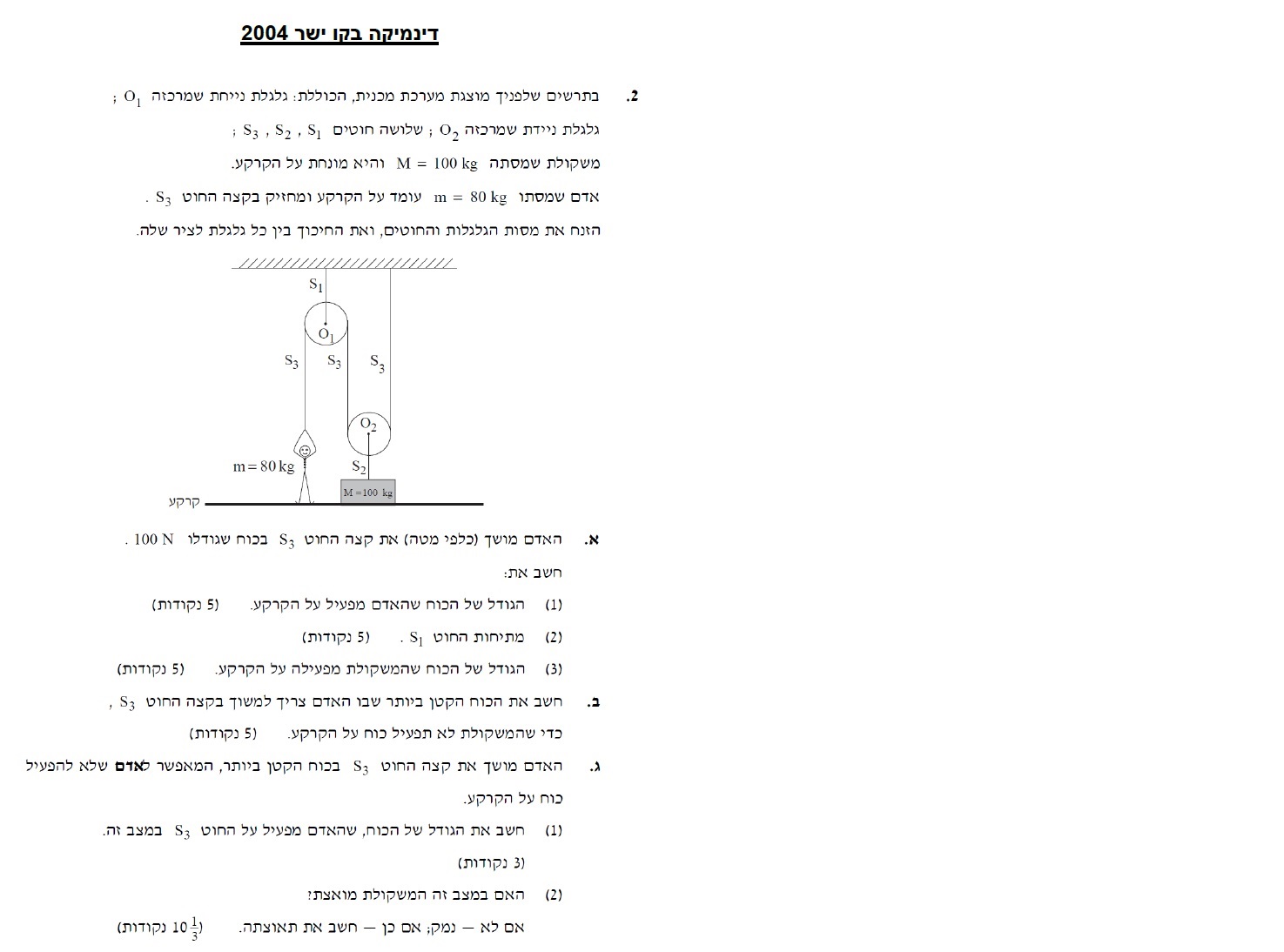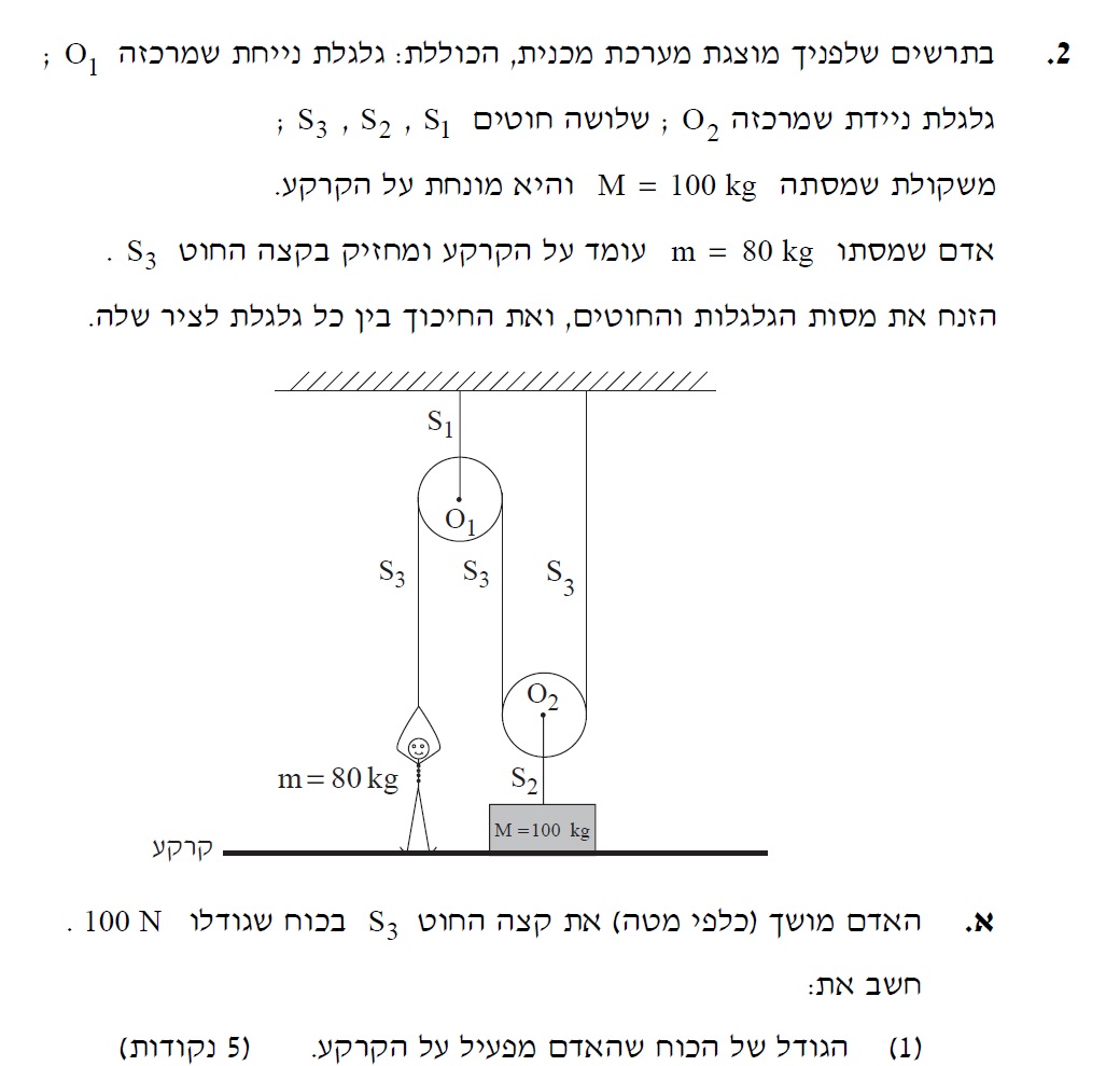 2. ההיגיון בתאוצה שהתקבלה ממשוואת התנועה: האדם מפעיל 800 ניוטון על חוט 3. שקול הכוחות הפועלים על הגלגלת הניידת שווה לאפס , לכן המתיחות בחוט 2 חייבת להיות 1600 ניוטון . חוט 2 מפעיל על המשקולת 1600 ניוטון כלפי מעלה , כוח הכובד מפעיל על המשקולת 1000 ניוטון כלפי מטה , בכוח השקול הפועל על המשקול הוא 600 ניוטון כלפי מעלה , מהחוק השני בהתאם למסתה של המשקולת , תאוצתה 6 מטר לשנייה בריבוע.