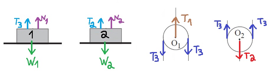 נסמן את האדם כגוף 1, ואת המשקולת כגוף 2. ונערוך תרשים לגופים ולגלגלות: