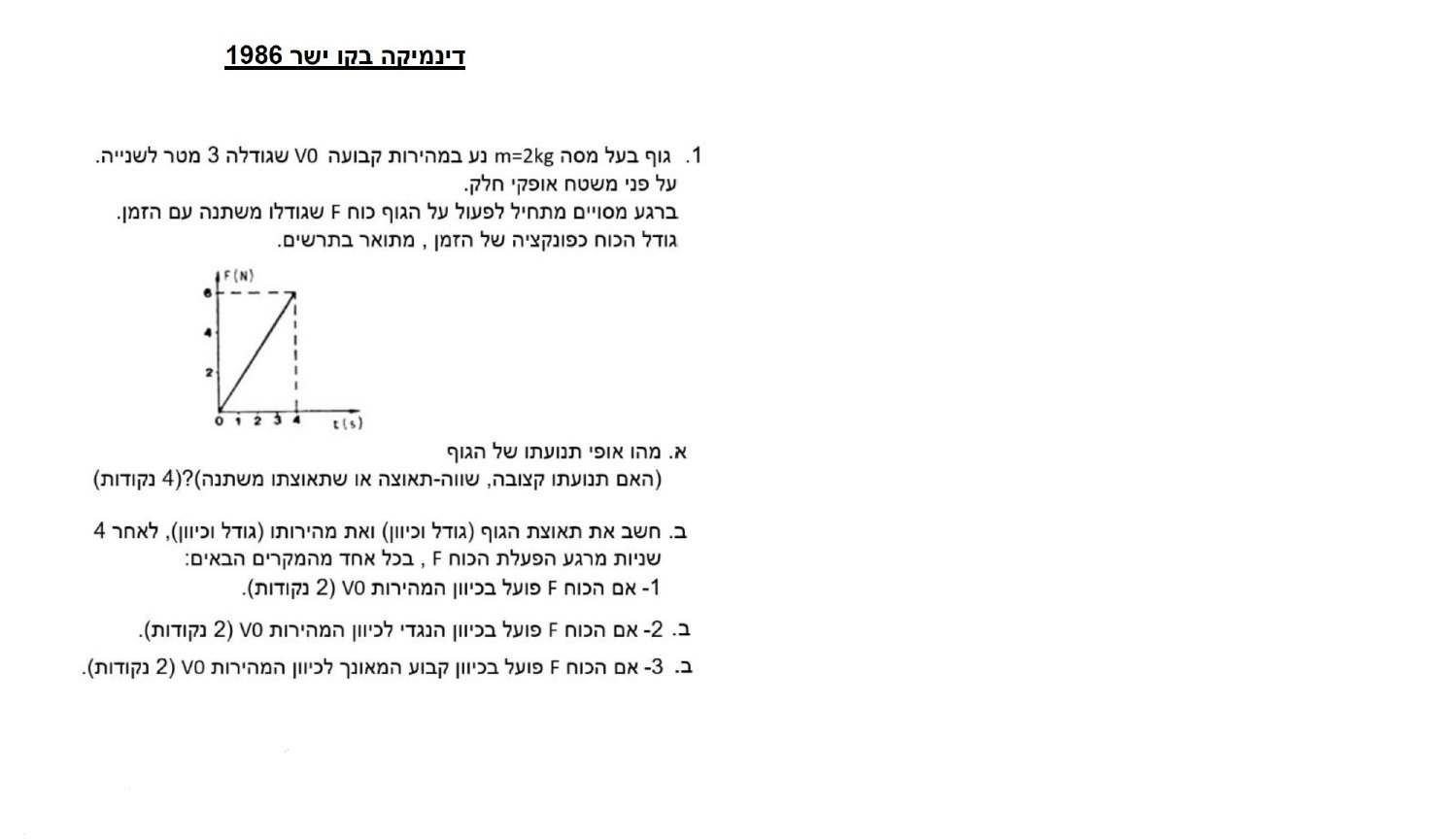 מהגרף ניתן לראות שגודלו של הכוח הפועל על הגוף ברגע t=4d הוא 6 ניוטון.