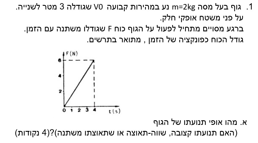 הכוח האופקי F הפועל על הגוף הולך וגדל בקצב קבוע בארבעת השניות הראשונות.