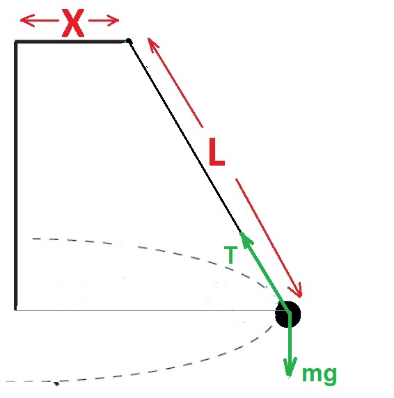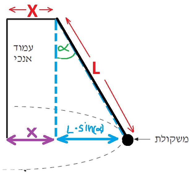 תוספת הזרוע האופקית גורמת להגדלת רדיוס הסיבוב, נבטא את רדיוס הסיבוב בתלות ב X אורך הזרוע ו - L אורך החוט.