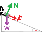 הגוף נע בכיוון מורד המישור, הכוח F פועל בכיוון התנועה. הכוח fk פועל נגד כיוון התנועה .