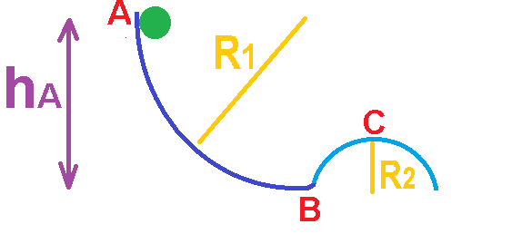 הגוף נע ממנוחה לכן האנרגיה הקינטית בנקודה A שווה לאפס. גובה הנקודה A שווה ל R1. גובה הנקודה C שווה ל R2.