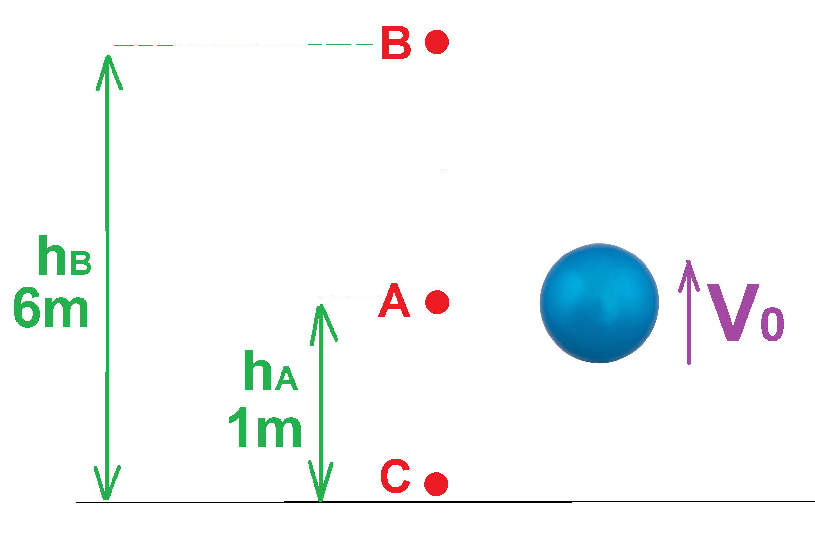 כדי למצוא את מהירות הכדור ברגע הפגיעה בקרקע נכתוב את משוואת שימור האנרגיה , נשווה בין האנרגיה המכנית הכוללת בנקודה A לאנרגיה המכנית הכוללת בנקודה C.