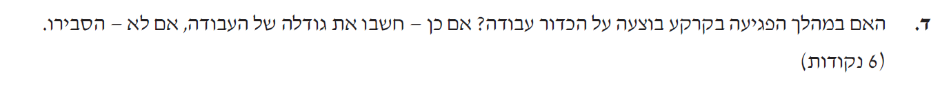 לכן, גודל מהירות הכדור ברגע זריקתו «math xmlns=¨http://www.w3.org/1998/Math/MathML¨»«mstyle mathsize=¨20px¨»«mrow mathcolor=¨#FF0000¨»«mo stretchy=¨true¨ mathvariant=¨bold¨»|«/mo»«msub»«mi mathvariant=¨bold¨»V«/mi»«mn mathvariant=¨bold¨»0«/mn»«/msub»«mo stretchy=¨true¨ mathvariant=¨bold¨»|«/mo»«/mrow»«mo mathvariant=¨bold¨ mathcolor=¨#FF0000¨»=«/mo»«mn mathvariant=¨bold¨ mathcolor=¨#FF0000¨»10«/mn»«mfrac mathcolor=¨#FF0000¨»«mi mathvariant=¨bold¨»m«/mi»«mi mathvariant=¨bold¨»s«/mi»«/mfrac»«/mstyle»«/math» קטן מגודל מהירות פגיעת הכדור בקרקע «math xmlns=¨http://www.w3.org/1998/Math/MathML¨»«mstyle mathsize=¨20px¨»«mi mathvariant=¨bold¨ mathcolor=¨#FF0000¨»V«/mi»«mo mathvariant=¨bold¨ mathcolor=¨#FF0000¨»=«/mo»«mn mathvariant=¨bold¨ mathcolor=¨#FF0000¨»10«/mn»«mo mathvariant=¨bold¨ mathcolor=¨#FF0000¨».«/mo»«mn mathvariant=¨bold¨ mathcolor=¨#FF0000¨»95«/mn»«mfrac mathcolor=¨#FF0000¨»«mi mathvariant=¨bold¨»m«/mi»«mi mathvariant=¨bold¨»s«/mi»«/mfrac»«/mstyle»«/math» .