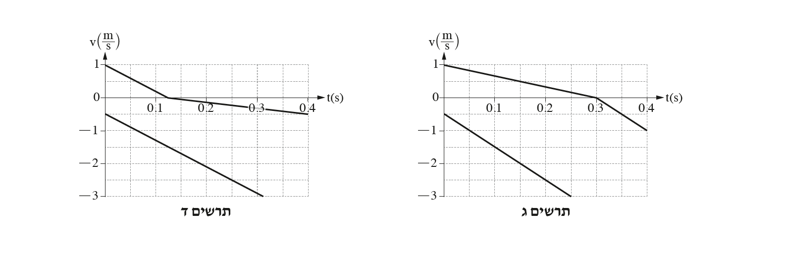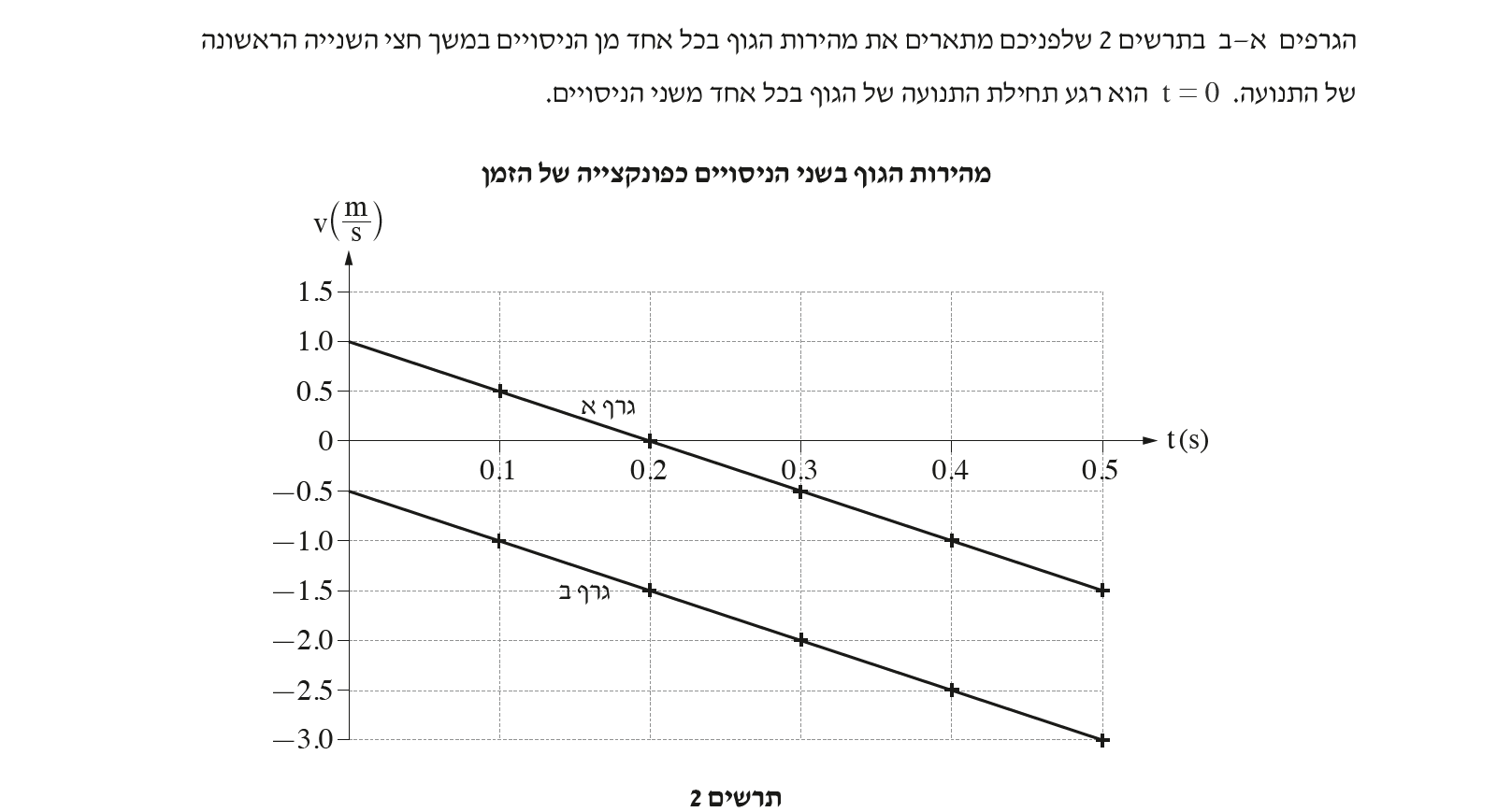 גרף ב' מתאר תנועתו של גוף הנע כל הזמן במהירות שלילית (נגד כיוון הציר). תיאור זה מתאים לתנועת הגוף בניסוי השני.
