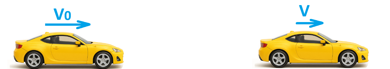 באיור הבא מתוארת המכונית ו- וקטורי המהירויות בתחילת התנועה «math xmlns=¨http://www.w3.org/1998/Math/MathML¨»«mstyle mathsize=¨20px¨»«mover mathcolor=¨#0000FF¨»«msub»«mi mathvariant=¨bold¨»V«/mi»«mn mathvariant=¨bold¨»0«/mn»«/msub»«mo mathvariant=¨bold¨»§#8594;«/mo»«/mover»«/mstyle»«/math» ובסיום התנועה «math xmlns=¨http://www.w3.org/1998/Math/MathML¨»«mstyle mathsize=¨20px¨»«mover mathcolor=¨#0000FF¨»«mi mathvariant=¨bold¨»V«/mi»«mo mathvariant=¨bold¨»§#8594;«/mo»«/mover»«/mstyle»«/math».