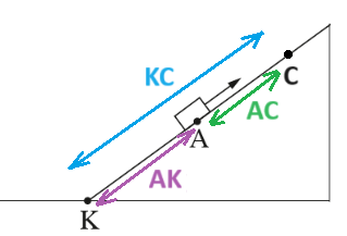 البعد AK يساوي المسافة التي يقطعها الجسم أثناء الهبوط (KC) مطروحاً منها المسافة التي يقطعها الجسم في الصعود (AC)، كما ترى في الشكل التالي: