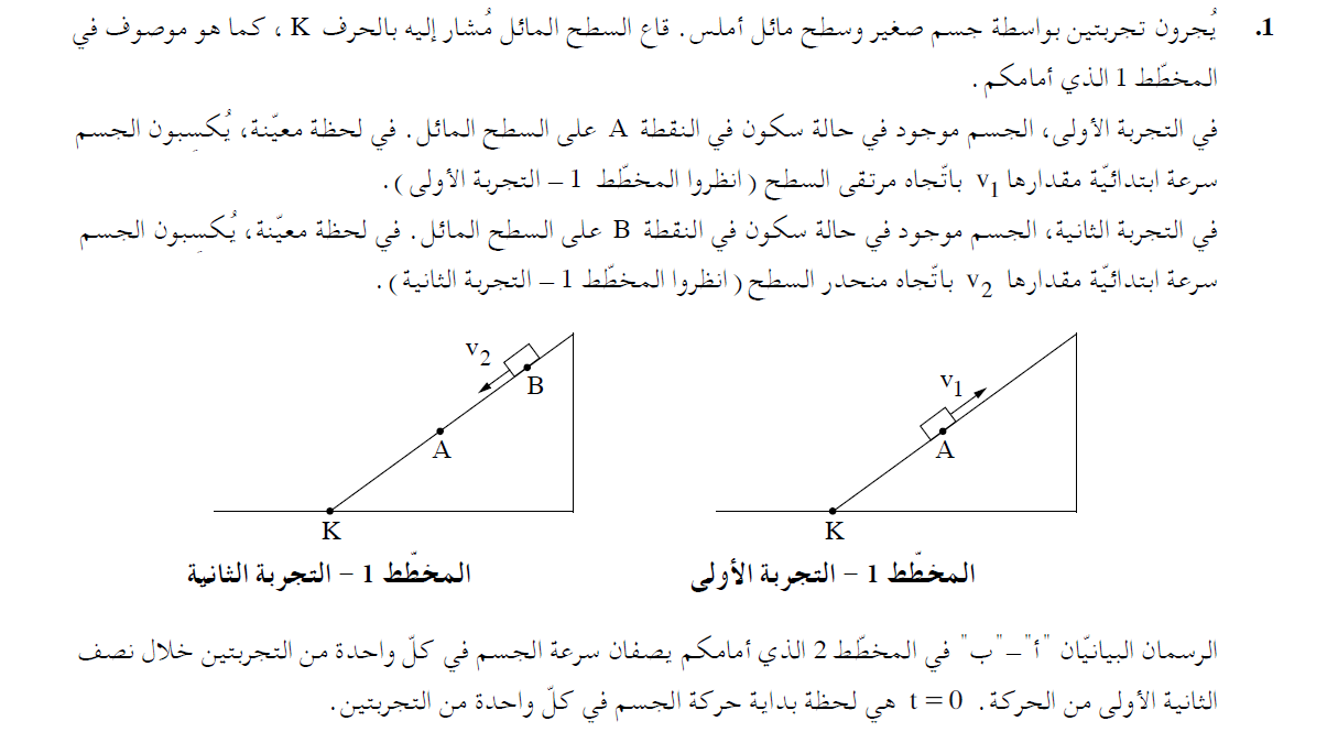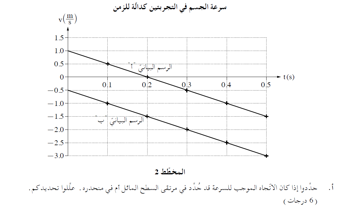 3. يتناول السؤال تجربتين (حركتين مختلفتين) ورسمين بيانيين، قبل تحديد اتجاه المحور، يجب أولا تحديد التجربة الموصوفة في كل رسم بياني.