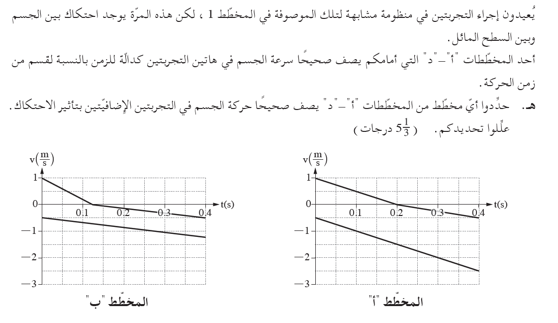 بمساعدة فهم تأثير الاحتكاك على تسارع الجسم في كل تجربة، من الممكن تحديد المخطط الذي يصف حركة الجسم بشكل صحيح، في التجربتين.