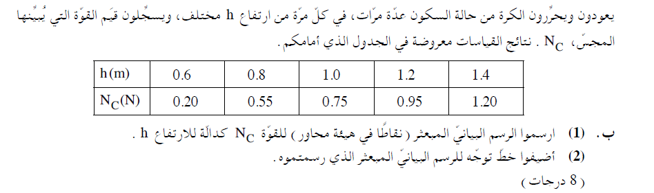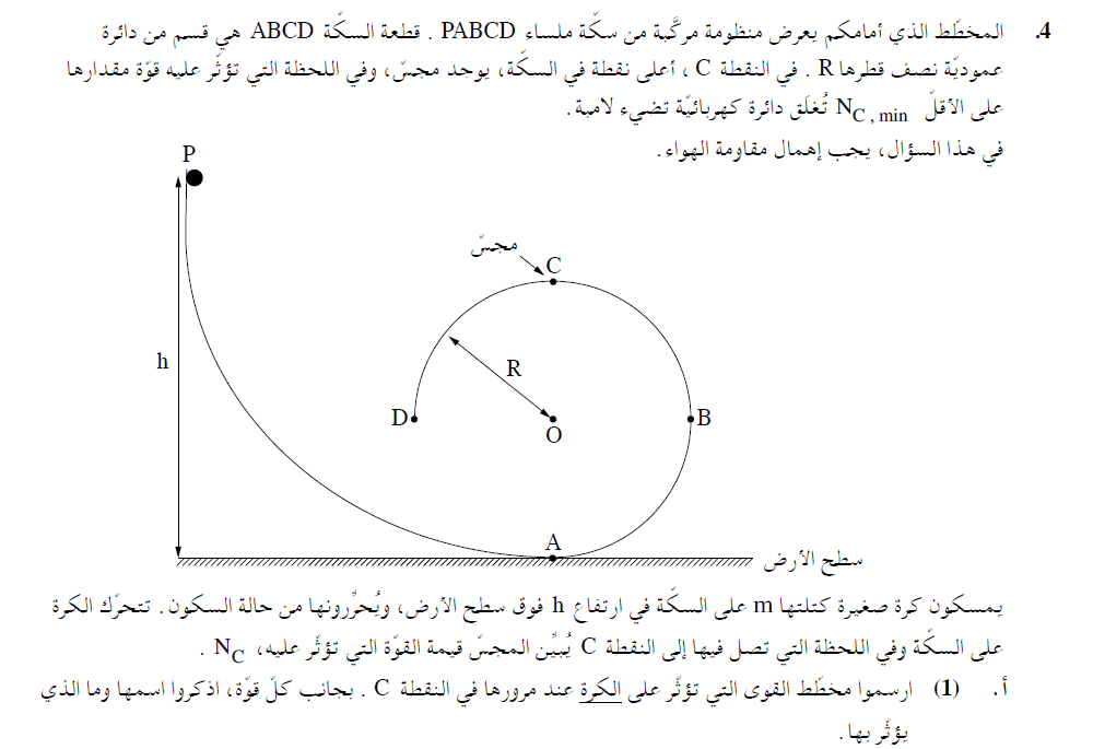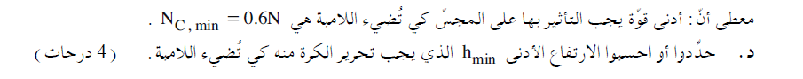 أقل ارتفاع يجب أن تنحرر منه الكرة حتى يضيء المصباح، هو الارتفاع حيث تكون القوة العمودية في النقطة C تيساوي 0.6 نيوتن،