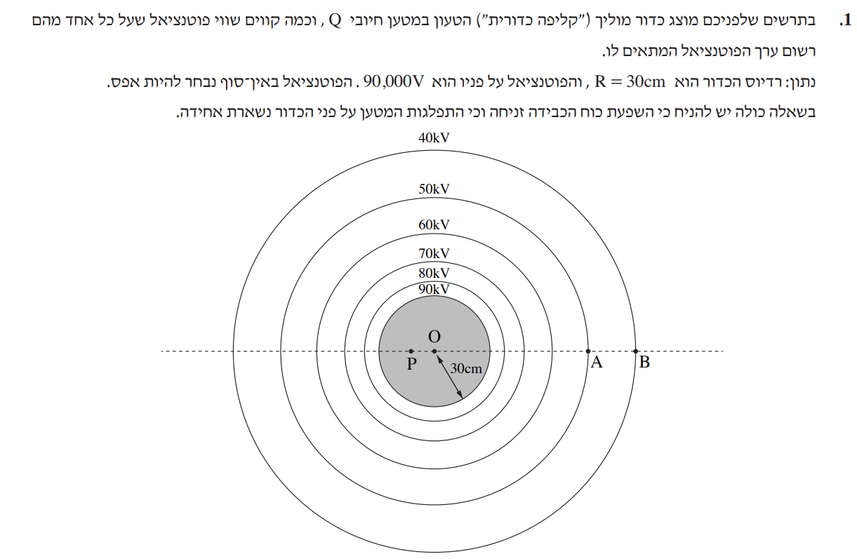 2. אין צורך לכתוב נימוק מלא. יש לציין שהנקודה נמצאת בתוך הכדור, לכן הפוטנציאל בנקודה שווה לפוטנציאל על פני הכדור.