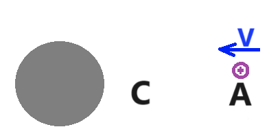 מנתוני השאלה ניתן להבין שהגוף טעון במטען חיובי, הוא נזרק מהנקודה A שמאלה וחולף בנקודה C . כמתואר באיור הבא: