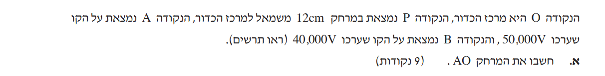 המרחק AO הוא המרחק שבין הנקודה A לנקודת מרכז הכדור. נתון שהפוטנציאל בנקודה A הוא 50,000 וולט.
